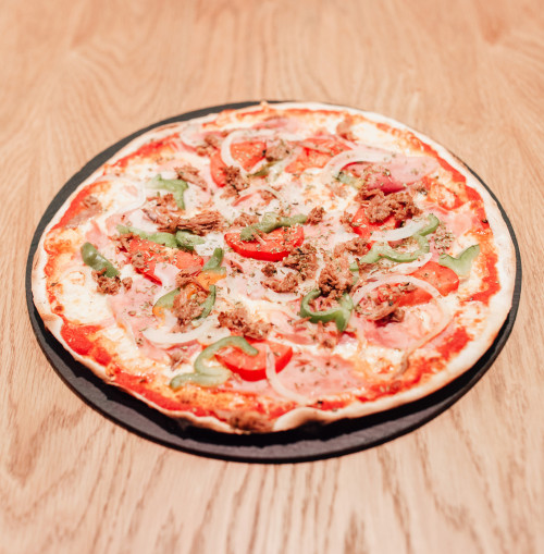 Pizza de masa fina casera con tomate natural y mozarella fresca de la mejor calidad con los siguientes ingredientes: jamón york, atún, cebolla, tomate natural en rodajas, pimiento y orégano.